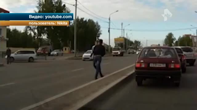 Легковушка прижимает хетчбэк к обочине, затем обгоняет и заставляет остановиться. Дебошир мгновенно выскакивает из машины и начинает наносить удары оппоненту. Затем за ноги вытаскивает бедолагу из салона и продолжает избиение.