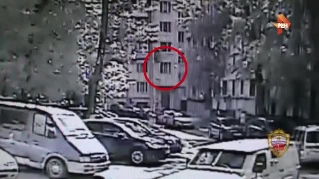 На кадрах ролика видно, как мужчина, выбравшись из подъезда через окно, расположенное на третьем этаже здания, спрыгнул с козырька подъезда.