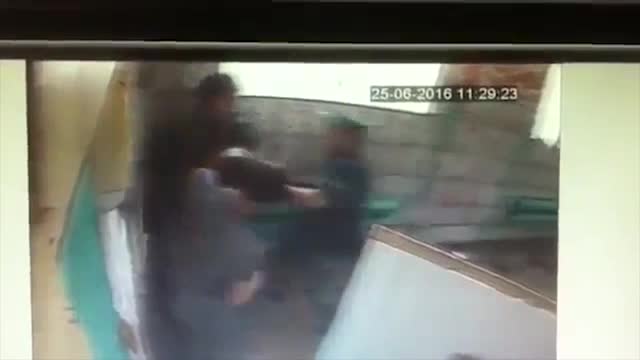 На кадрах видно, как арестант нападает на конвоира, избивает его и пытается сбежать.