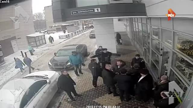 На кадрах с камеры наблюдения видно, как из иномарки представительского класса выскакивают крепкие молодчики и с ходу набрасываются на строителей и чиновника.