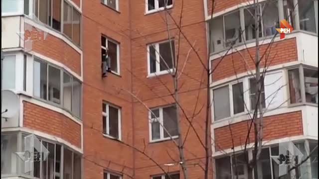 Мужчина, захвативший в заложники жену и детей в Москве, вылез из окна квартиры. Он повис на подоконнике и выкрикивает бессвязные слова.