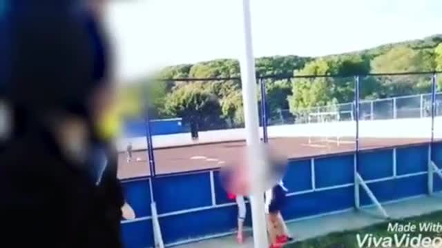 На кадрах видно, что все происходит рядом со спортплощадкой. Одна школьница сначала о чем-то разговаривает со своей сверстницей, после чего начинает ее бить. Она сначала хватает школьницу за горло, затем начинает бить ее руками, валит на землю, после чего избивает ногами.