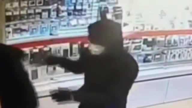 И лишь достав его, грабитель сразу осмелел. Начал кричать и угрожать расправой, но планы злоумышленника спутал сотрудник магазина. Он кидает в разбойника стул, от испуга грабитель пулей вылетает из заведения.