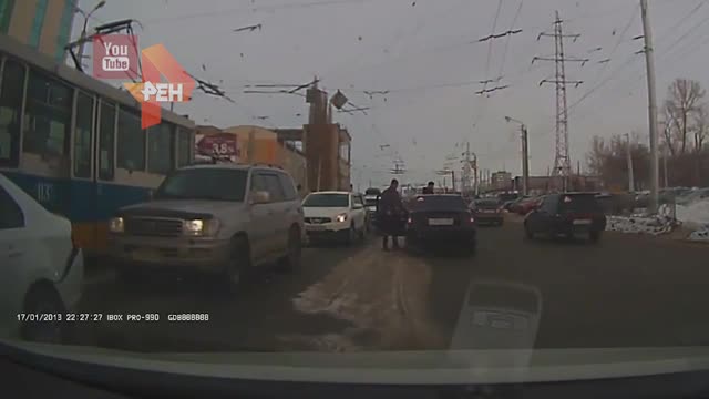 Произошедший вчера в Уфе дорожный конфликт между водителями маршрутки и легкового автомобиля попал на камеру видеорегистратора. Посреди оживленной дороги на глазах у множества очевидцев водитель маршрутки дважды выстрелил в своего обидчика, ударившего по микроавтобусу ногой, после чего водитель легковушки как ни в чем не бывало достал биту и продолжил дорожную разборку.