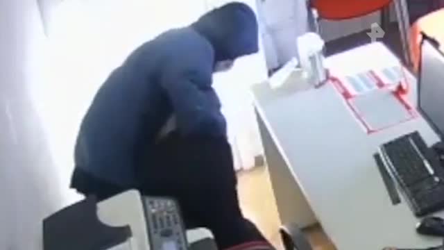 В помещение заходит мужчина. На лице медицинская маска, на голове капюшон. Он моментально достает нож и, угрожая светловолосой сотруднице, требует отдать все наличные. Ее коллега недолго думая кладет на стол 2 тысячи рублей. Воспользовавшись моментом, блондинка пытается отодвинуть руку разбойника подальше от себя. Реакция налетчика не заставила себя ждать, и он буквально скручивает девушку.