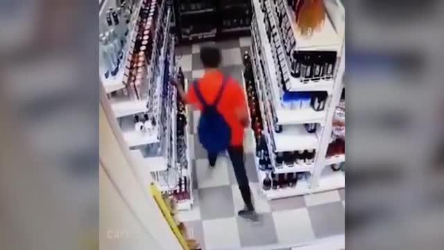 На видео из магазина видно, как молодой парень в красной футболке стянул с прилавка батон колбасы и засунул его в брюки. Чуть позже туда же отправилась бутылка водки.