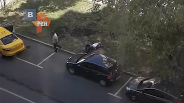 На ролике видно, как такси останавливается в одном из дворов на северо-западе Москвы и из него выходят водитель и пассажир. Мужчины начинают ожесточенно драться.