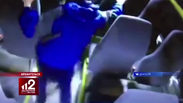 В Архангельске прямо в автобусе жестоко избили кондуктора. Сначала его со всей силы колотят кулаками по голове, затем, прямо как в реслинге, двумя ногами бьют в спину. Молодой человек падает на пол между сидений.