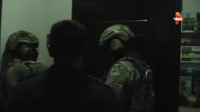 На кадрах видно, как оперативники врываются в место, где находятся мужчины, а затем скручивают их и надевают на них наручники.