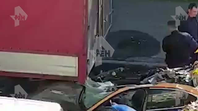 РЕН ТВ публикует кадры с места аварии в Юрьевском переулке в Москве, жертвой которой стал известный российский режиссер Игорь Хомский. Как сообщалось ранее, 42-летний мужчина, управляя каршеринговым автомобилем, влетел в припаркованный КамАЗ.