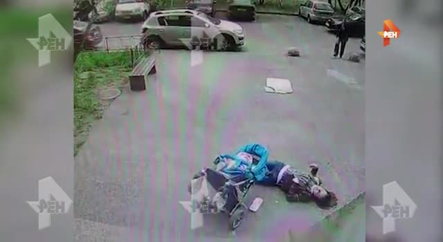 Женщина успела накрыть собой коляску с ребенком. Пострадавшая с травмой головы в тяжелом состоянии доставлена в больницу. По предварительным данным, ее малыш не пострадал.
