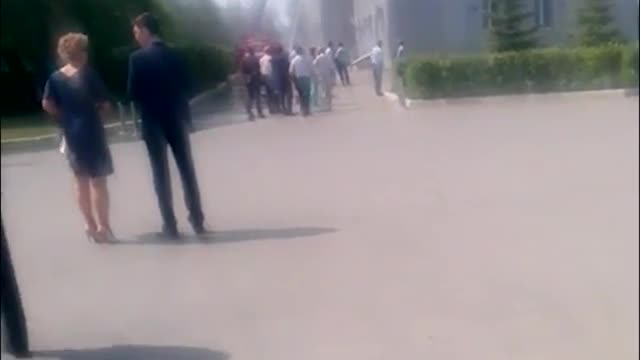 На кадрах видно, как из окон здания идет густой дым, а вокруг комбината собрались очевидцы и работники учреждения.