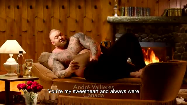 Исландский пауэрлифтер разделся до пояса и лег на диване возле камина. Он зачитал письма от поклонников сериала под медленную романтическую музыку.