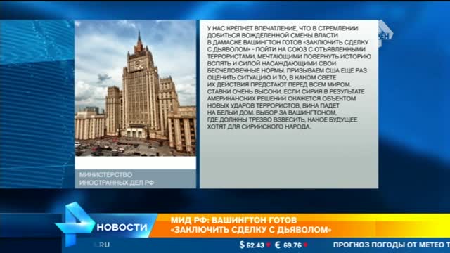 "У нас крепнет впечатление, что в стремлении добиться вожделенной смены власти в Дамаске Вашингтон готов "заключить сделку с дьяволом" — пойти на союз с отъявленными террористами, мечтающими повернуть историю вспять и силой насаждающими свои бесчеловечные нормы", — сообщили в российском дипломатическом ведомстве.