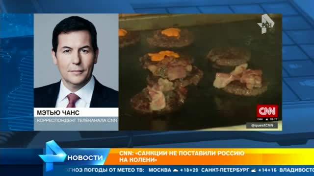 "России удается избежать финансового коллапса, который, как предсказывали многие, должен поставить ее на колени. Частично причина в самообеспечении. Например, в этом популярном бургер-баре в Москве подается мясо только российского производства", — сказал корреспондент телеканала CNN Мэтью Чанс.