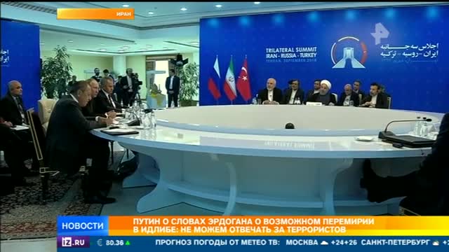 В это время Владимир Путин уже побеседовал с президентом Турции Тайипом Реждепом Эрдоганом и отправился на саму трехстороннюю встречу. И конечно, как и ожидалось, главной темой стала ситуация вокруг сирийского Идлиба - последнего оплота террористов в арабской республике.
