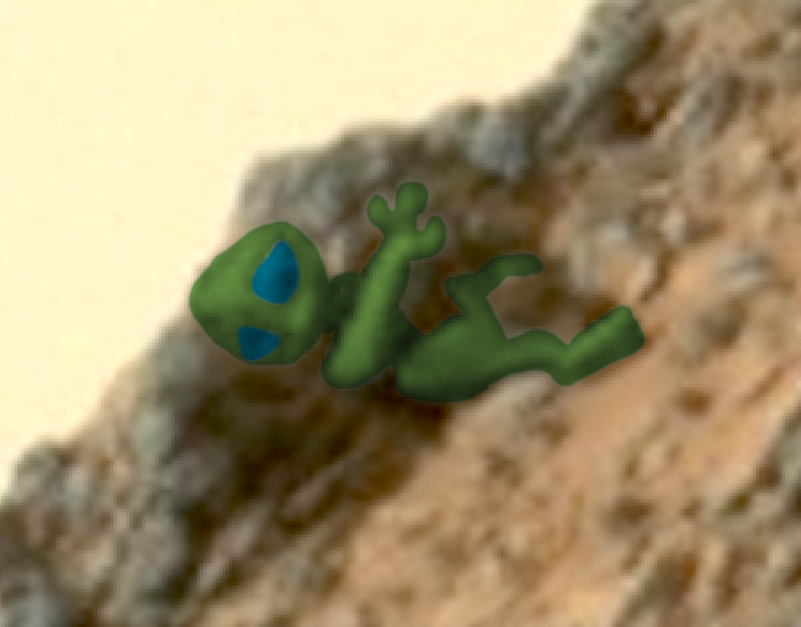 Автор публикации утверждает, что неизвестный объект похож на персонажа из мультфильма. Уфолог увеличил и разукрасил снимок, сделанный космическим аппаратом, и разглядел фигуру.