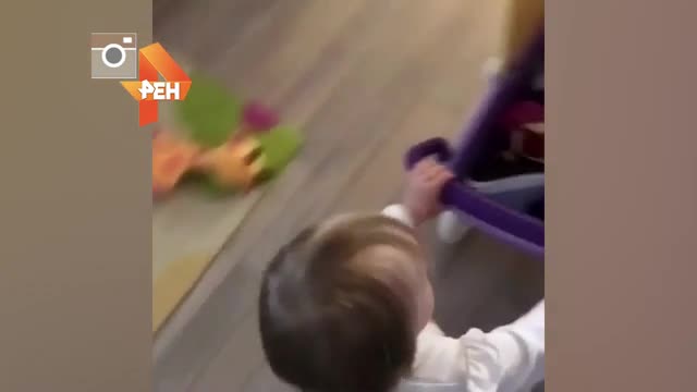 На кадрах можно увидеть, как малышка катит перед собой коляску для кукол, в которой вместо ляльки лежит обувь.