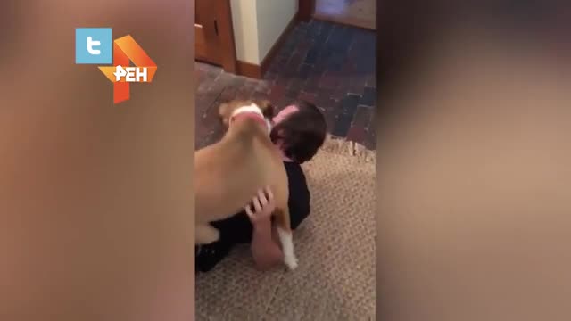 На кадрах Эванс валяется на полу "в объятиях" своего пса. Животное неподдельно радо видеть хозяина после долгой разлуки.