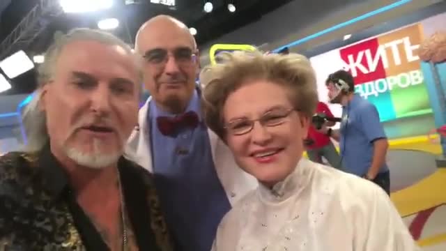 На этих кадрах запечатлено, как эпатажный артист скандирует на свой лад название ее программы "Жить здорово". Сама она стоит рядом с ним, явно не зная, что сказать. Джигурда приобнимает ее рукой.