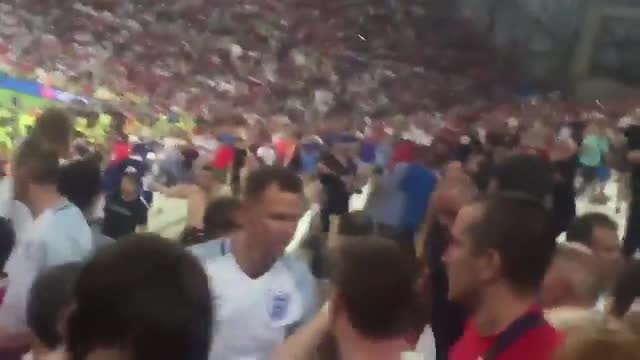 Как сообщает BBC со ссылкой на очевидцев, с трибун, где сидели россияне, была выпущена ракета, громкий хлопок испугал британцев, и некоторые английские фанаты начали перелезать через барьеры для разделения секторов.