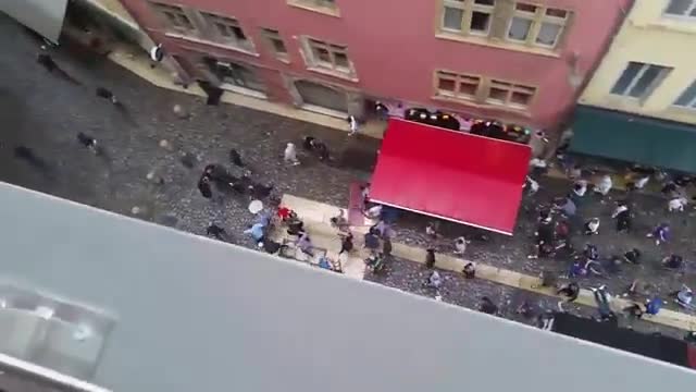 Стычка футбольных фанатов Франции и Англии попала на видео. На кадрах разъяренная толпа бросается стульями, бутылками и всем, что попадается под руку. Конфликт произошел во французском Лионе.