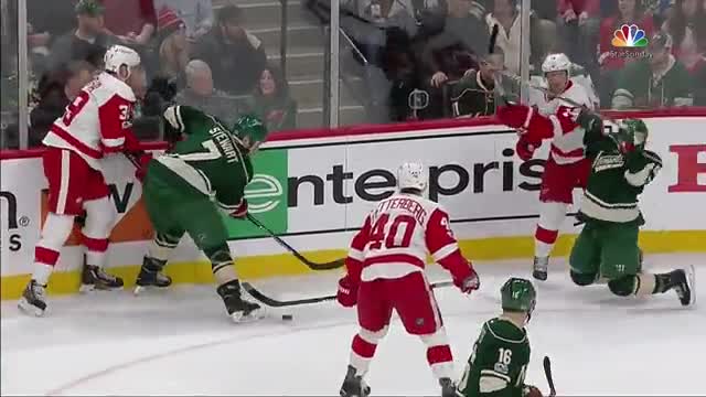 Шведский хоккеист Густав Нюквист из "Детройт Ред Уингз" ударил своего соперника из "Миннесоты Уайлд" Джареда Спаржона клюшкой по лицу, что привело к потасовке на льду.