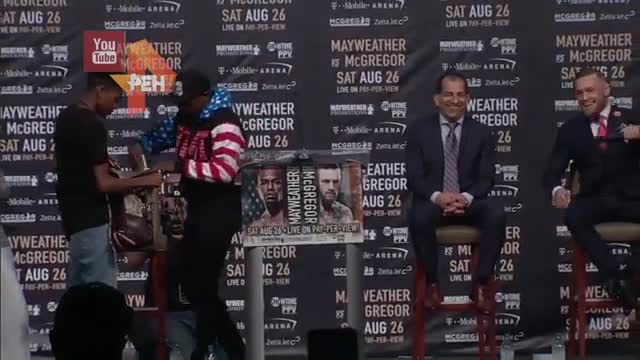Американский боксер Флойд Мэйуэзер похвастался чеком на 100 млн долларов на пресс-конференции перед боем с ирландским мастером смешанных единоборств Конором Макгрегором. Видео инцидента опубликовано в YouTube-аккаунте ESPN.