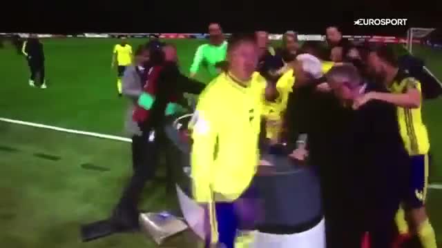 Футболисты сборной Швеции разнесли стойку комментаторов канала Eurosport. Таким образом они отпраздновали выход в финальную часть чемпионата мира по футболу – 2018.