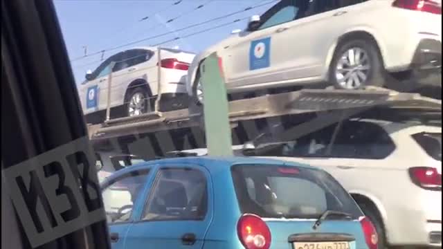 На кадрах видеозаписи видно, как автовозы с подарочными машинами следуют по Варшавскому шоссе.