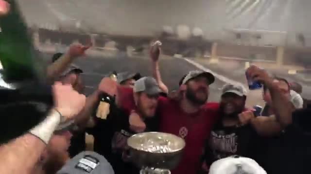 После церемонии награждения на льду и круга почета на переполненной арене хоккеисты продолжили праздновать победу в раздевалке. Вся команда хором спела бессмертный хит группы Queen We are the champions.