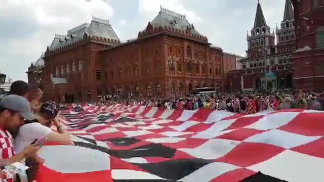 Хорватские болельщики растянули огромный баннер на Манежной площади в Москве, чтобы поддержать свою сборную перед финалом ЧМ по футболу. Об этом сообщает ТАСС.