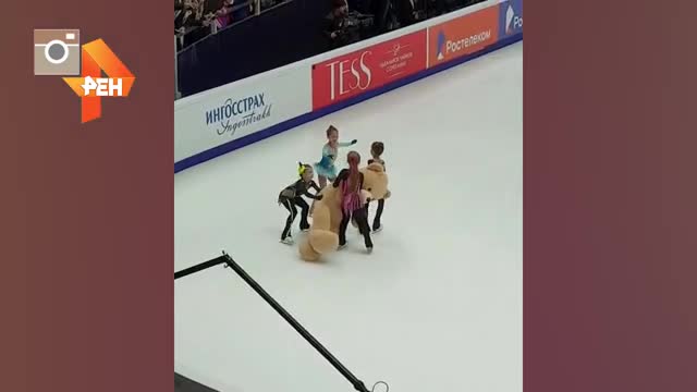 Видео: Маленькие фигуристки еле утащили со льда огромного мишку, брошенного Загитовой фанатами