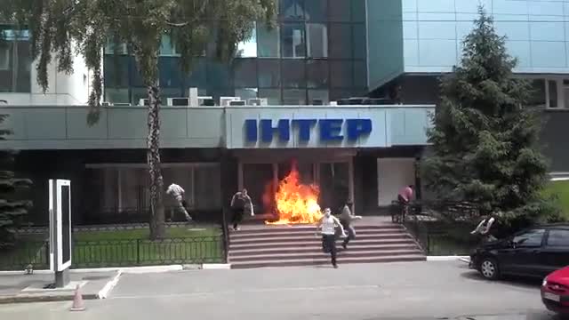 Неизвестные в масках с помощью шин и зажигательной смеси подожгли вход в офис украинского телеканала «Интер». Видео своего деяния активисты сами выложили на YouTube.