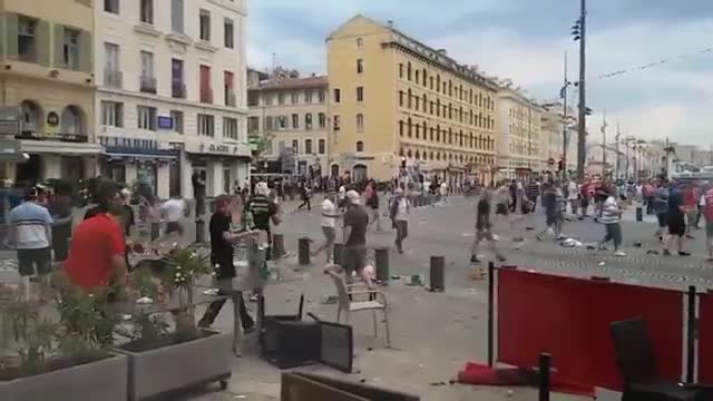 Появилось видео с места стычки российских и английских фанатов у одного из пабов в Марселе. Также в потасовке приняли участие французские болельщики.