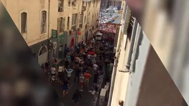 Российские болельщики оказались загнаны в угол тысячей фанатов английской сборной в одной из улочек Марселя. Англичане бросают бутылки и приглашают россиян на битву в стиле "300 спартанцев".