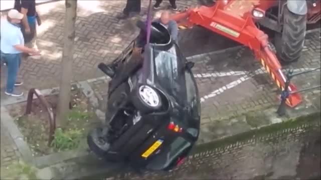 Камера засняла гонки Porsche Cayenne и катера. На кадрах видно, как черный автомобиль пытается обогнать рядом идущий по каналу катер. Однако, не справившись с управлением на повороте, Porsche влетает в припаркованный автомобиль. От удара маленькая машина падает в воду.