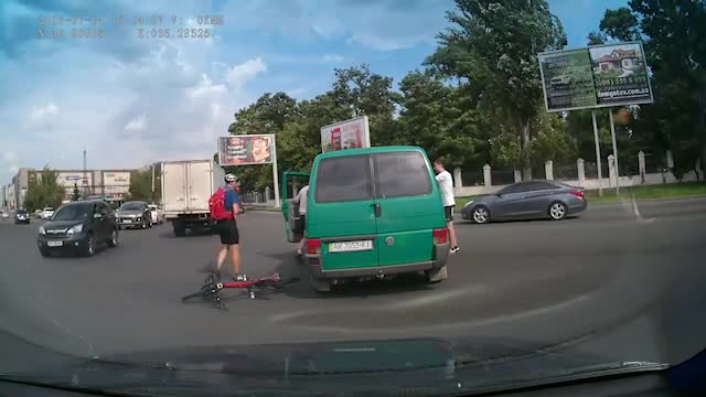 Автор видеоролика, разместивший его на YouTube, написал: "Велосипедисту поломали нос. Урок велосипедисту, аккуратно на дорогах. Велосипедист подрезал микроавтобус".