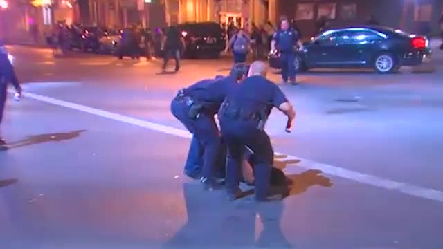 Пока он стоял приходя в себя, один из стражей порядка схватил его за косички и повалил на землю. После этого несколько полицейских с трудом оттащили крупного мужчину и надели на него наручники.