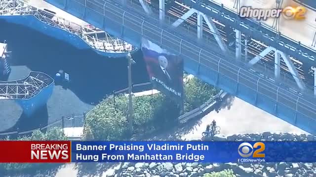 СМИ опубликовали видео, на котором запечатлен огромный портрет лидера Российской Федерации Владимира Путина, вывешенный на Манхэттенском мосту в Нью-Йорке. Транспарант появился там 7 октября ориентировочно в 14:30 по местному времени.