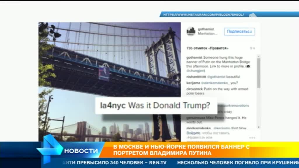 Ранее подобный баннер был размещен в Нью-Йорке. Его вывесили неизвестные прямо на Манхэттенском мосту. На нем глава государства запечатлен с российским и сирийским флагами с подписью Peacemaker, что в переводе означает "Миротворец". Плакат размером шесть на девять метров успел провисеть не меньше часа, прежде чем его сняла полиция. Кто его разместил – выясняют правоохранители. Американские пользователи выкладывают фотографии в Сеть и шутят, что это мог быть Дональд Трамп.