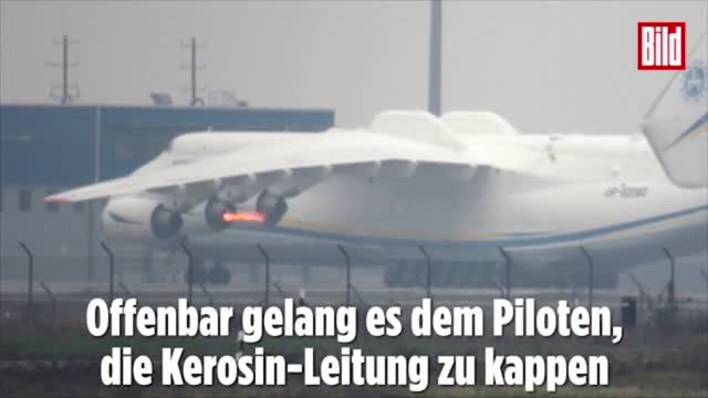 Грузовой самолет был вынужден приземлиться – на ролике запечатлен пожар второго из шести двигателей Ан-225. Огонь вырывался на протяжении по меньшей мере минуты.