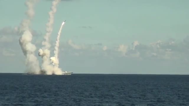 Министерство обороны Российской Федерации обнародовало кадры запуска крылатых ракет "Калибр" с борта фрегата "Адмирал Григорович". Это видео было снято с соседнего корабля.
