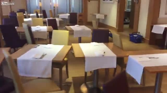На кадрах ролика видно, как стоящие в зале заведения столы и стулья сначала потихоньку начинают перемещать к одной стене помещения. Однако в результате усиления волн вся мебель оказывается в куче у стены ресторана.