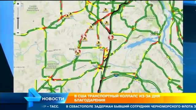 Сегодня жители США отмечает свой главный национальный праздник – День благодарения. Из-за этого в городах и на шоссе многокилометровые пробки. Гигантский затор снял беспилотник на выезде из Лос-Анджелеса. Машины там практически не двигаются. Парализована главная трасса, которая ведет из мегаполиса на юг. А для жителей города Портленд навигаторы стали использовать особый цвет для маркировки пробок. Помимо зеленого, желтого и красного некоторые участки сейчас отмечены черным: это когда движение полностью отсутствует.