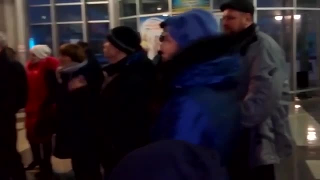 Люди собрались в здании железнодорожной станции и спели одну из самых известных советских песен, посвященную солдатам, павшим за Родину.