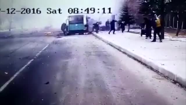 На записи видно, как автомобиль подъезжает к автобусу, стоящему на остановке, и взрывается. Возникает огромное облако дыма. Выжившие пассажиры выскакивают из автобуса.