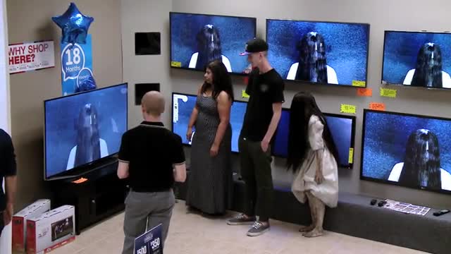На видео посетители магазина электроники разговаривают с продавцом возле телевизоров. Вдруг из экрана вылезает девушка в образе Самары Морган из "Звонка". Она подкрадывается и хватает покупателей.