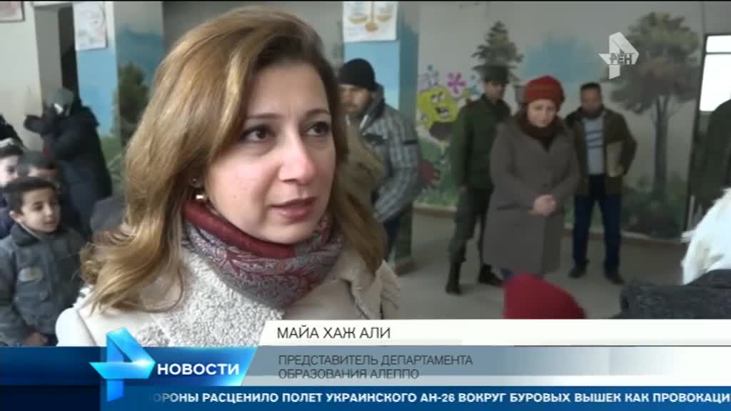 Следующий пункт назначения – средняя школа в восточной части города. Здесь ученикам раздают такие нужные ранцы со школьными принадлежностями. Внутри тетради, ручки, цветные карандаши. На каждом рюкзаке надпись: "От российских детей сирийским".