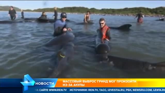 Пока одни добровольцы обливают выживших гринд водой и возвращают их в море, другие выстроились в живую цепь, чтобы не позволить животным вновь приблизиться к берегу.